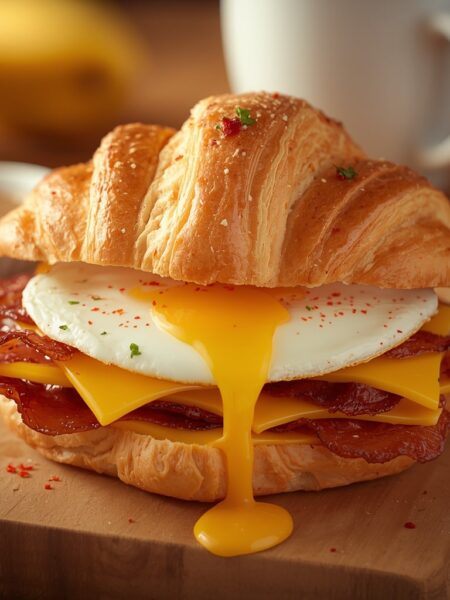 Breakfast Sandwich with Fried Egg, Bacon, and Cheddar on a Croissant
