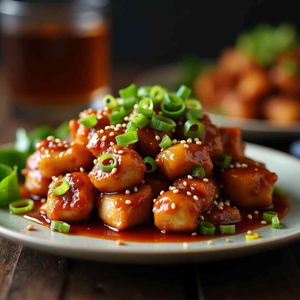 The chicken is coated in a flavorful teriyaki marinade, air-fried until juicy and caramelized, then finished with extra sauce for a glossy, savory finish.