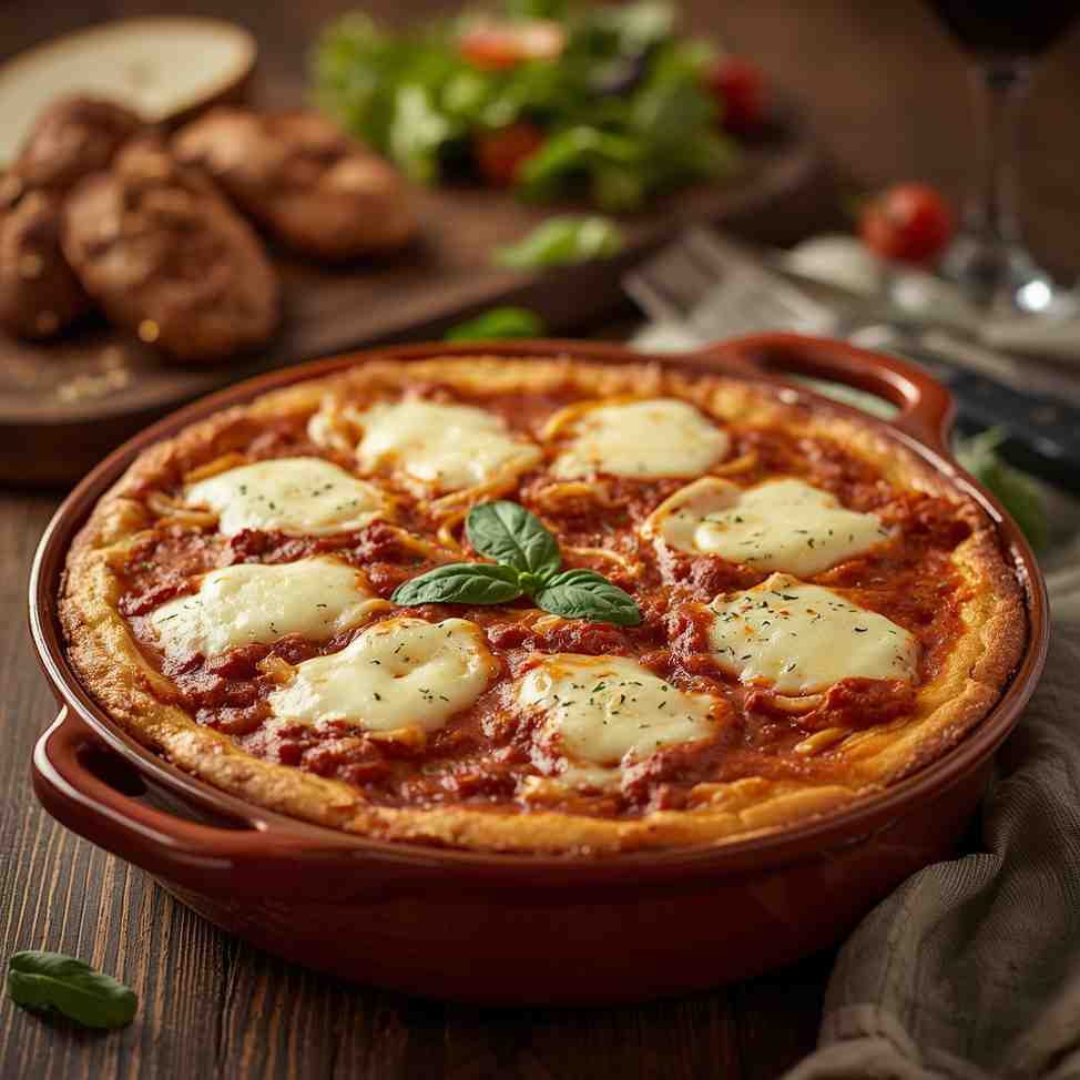 Step 5 — Assemble and Bake : Spread the meat sauce over cheese layer. Top with mozzarella and optional parmesan. Bake at 375°F (190°C) for 25–30 minutes or until bubbly and golden.