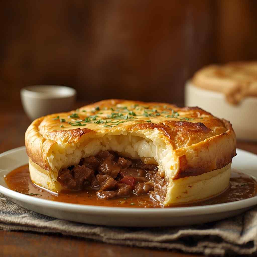 It features a savory beef and vegetable filling simmered in a flavorful gravy, topped with creamy mashed potatoes that bake into a golden, slightly crisp crust.