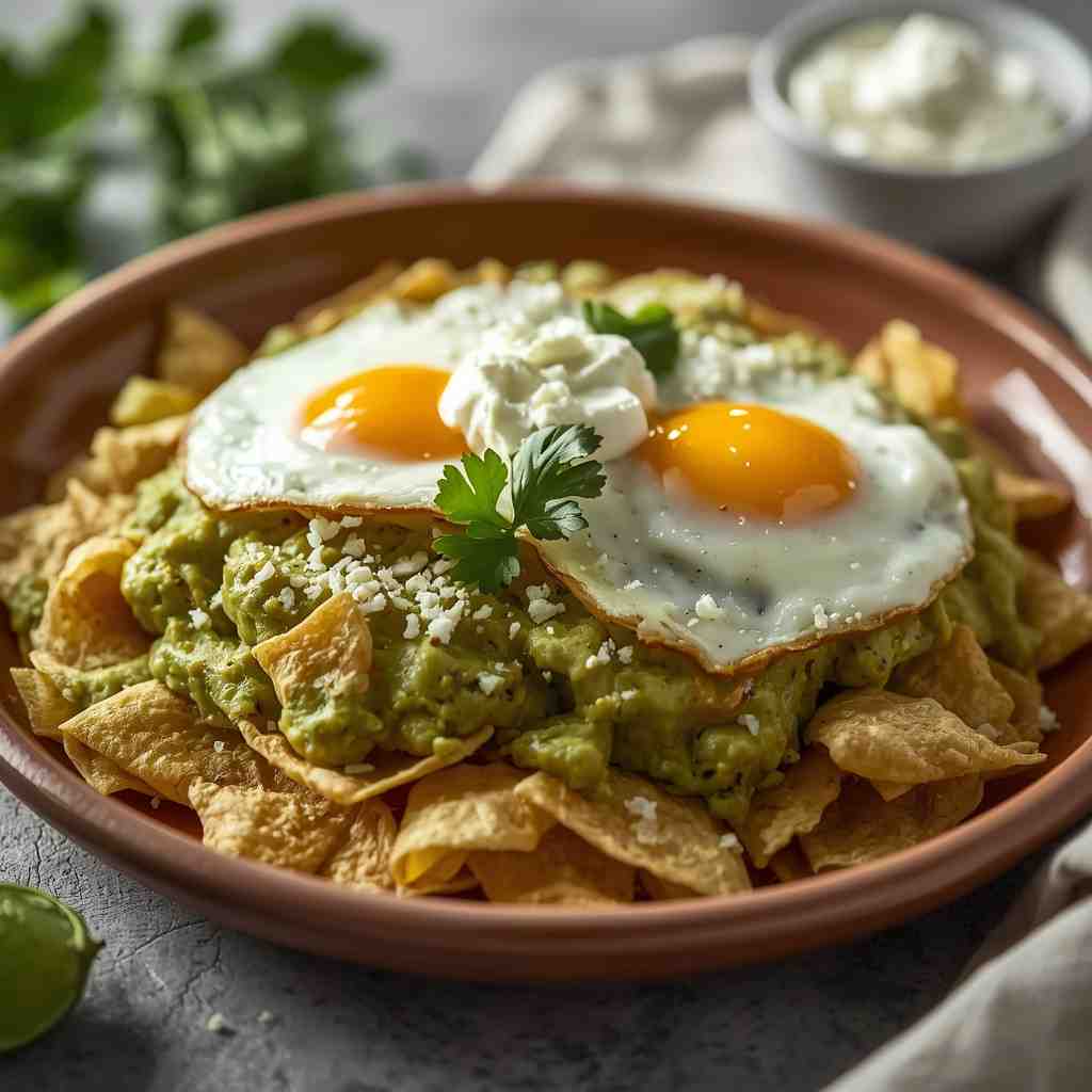 - Assemble: Serve chilaquiles topped with fried eggs, cheese, crema, avocado, and cilantro.