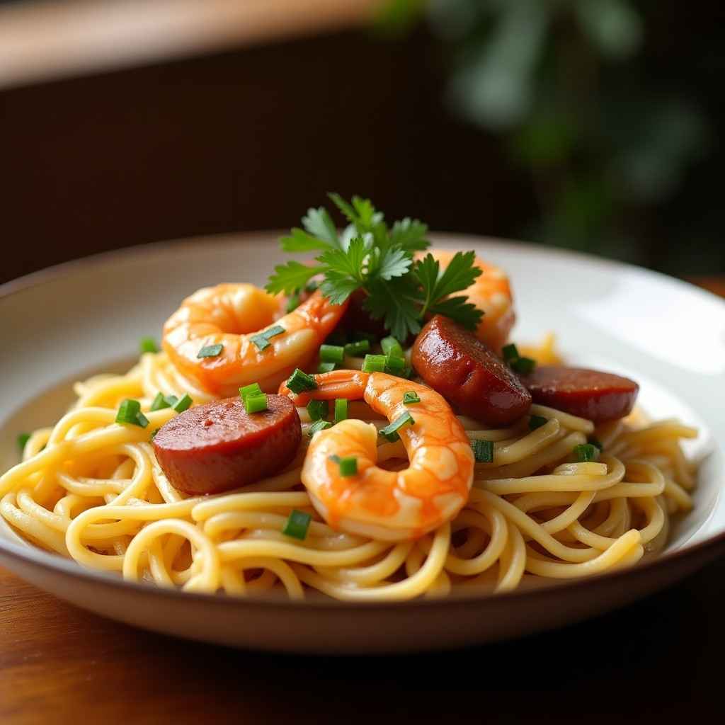 This dish is prepared by cooking the pasta separately while sautéing shrimp and sausage in Cajun spices. A creamy garlic sauce is then made in the same pan, allowing all the flavors to blend beautifully before everything is tossed together.
