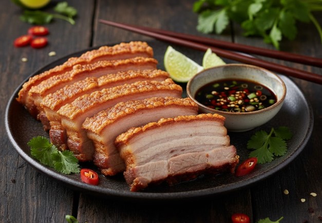 Crispy Pork Belly with Asian Dipping Sauce is a dish that celebrates the irresistible contrast of crunchy, golden skin and juicy, tender meat. Pork belly, a richly marbled cut, is slowly roasted until the fat renders and the skin crisps to perfection.