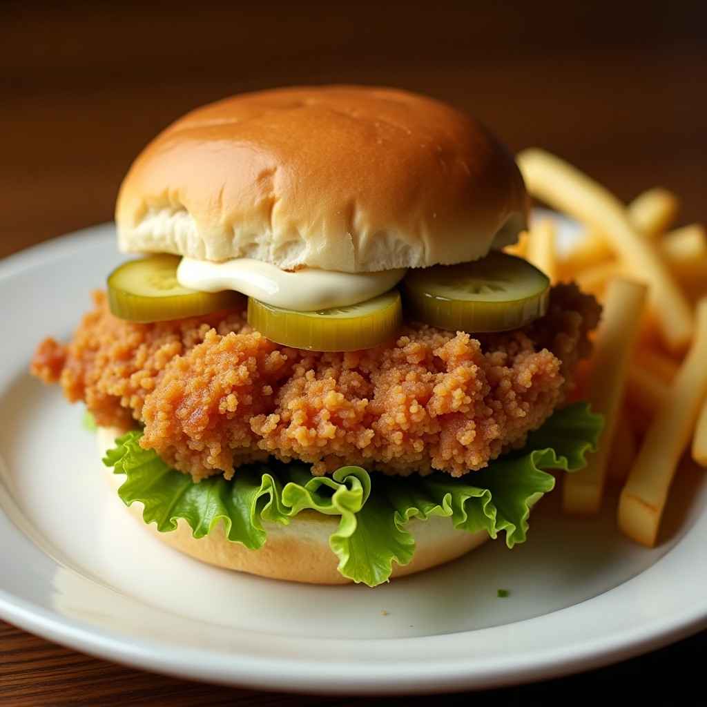 What makes this sandwich so special is the contrast of textures and flavors—the shatteringly crisp chicken coating, tender and juicy meat inside, the soft bun, and the sharp bite of pickles. It’s hearty, indulgent, and unforgettable.