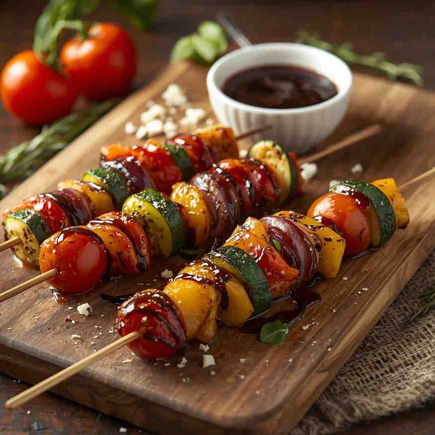 Grilled Vegetable Skewers with Balsamic Glaze is a colorful, fresh, and vibrant dish that perfectly captures the essence of summer dining. These skewers feature a medley of seasonal vegetables — such as bell peppers, zucchini, mushrooms, onions, and cherry tomatoes — grilled to smoky perfection and finished with a sweet-tangy balsamic glaze.
