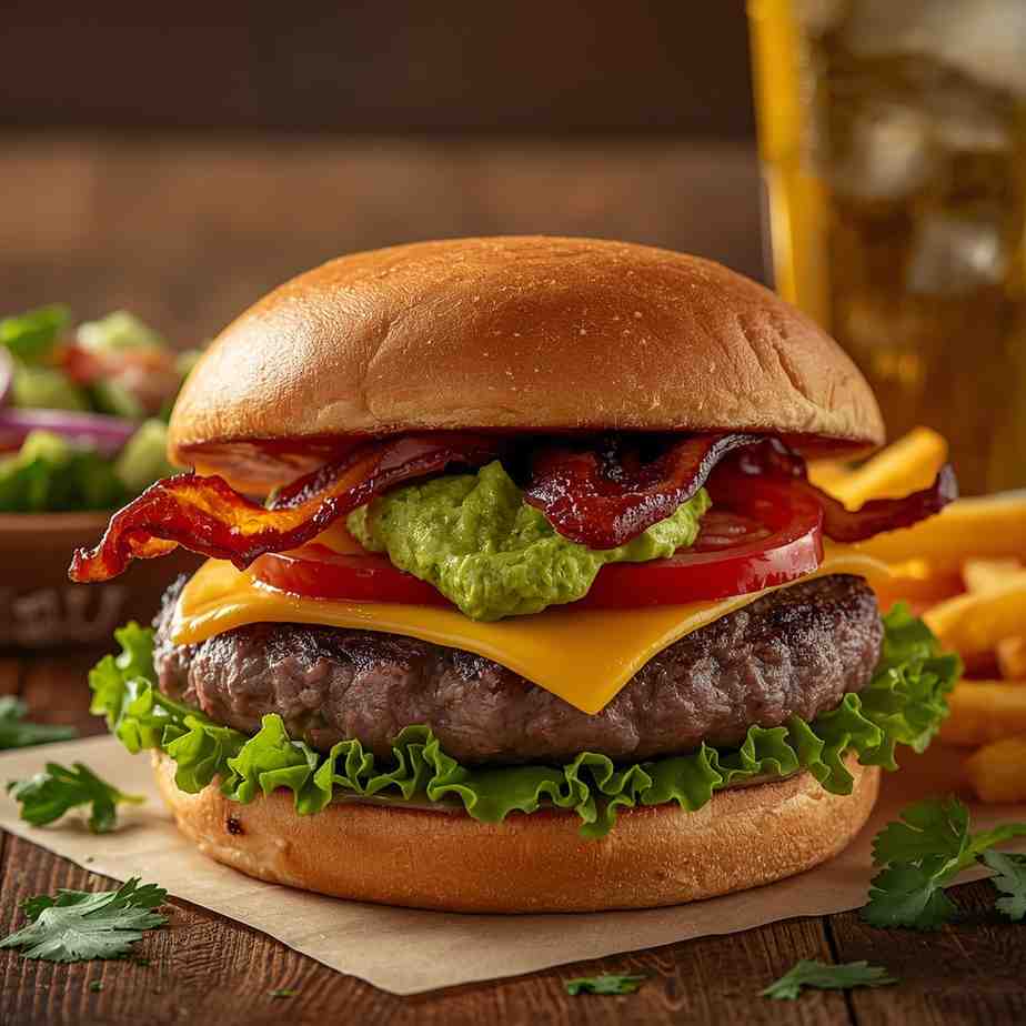 Unlike a standard burger, this one offers multiple textures and taste dimensions—rich, creamy avocado balances the saltiness of the bacon and the savory beef patty, while Monterey Jack cheese adds a mild but melty finish. Every bite feels like a complete experience: crunchy, creamy, smoky, fresh, and deeply satisfying.