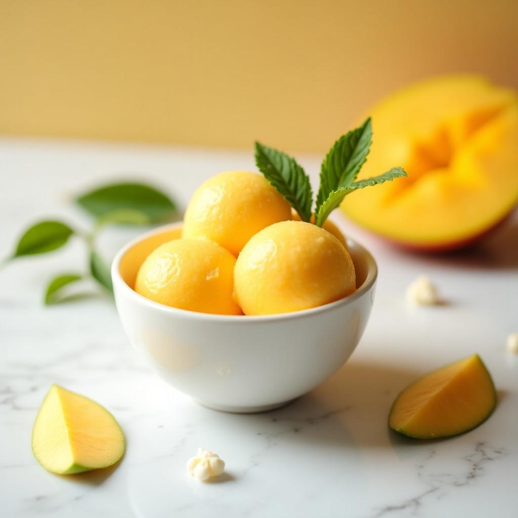 Serve mango sorbet in chilled bowls or dessert glasses. Garnish with fresh mint, mango slices, or a sprinkle of lime zest. It pairs beautifully with coconut cookies, fresh berries, or as a refreshing palate cleanser between courses.