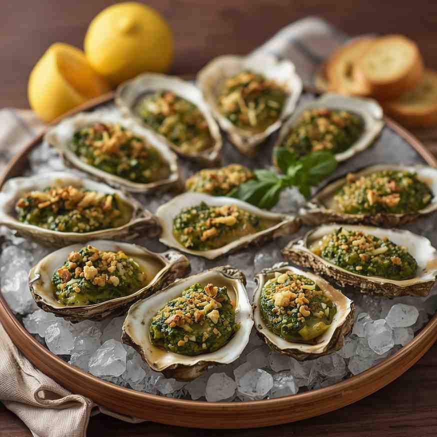 Serve Oysters Rockefeller immediately as an elegant appetizer. Arrange the oysters on a platter with lemon wedges for squeezing. They pair well with a crisp white wine, such as Sauvignon Blanc or Champagne, for a refined dining experience.