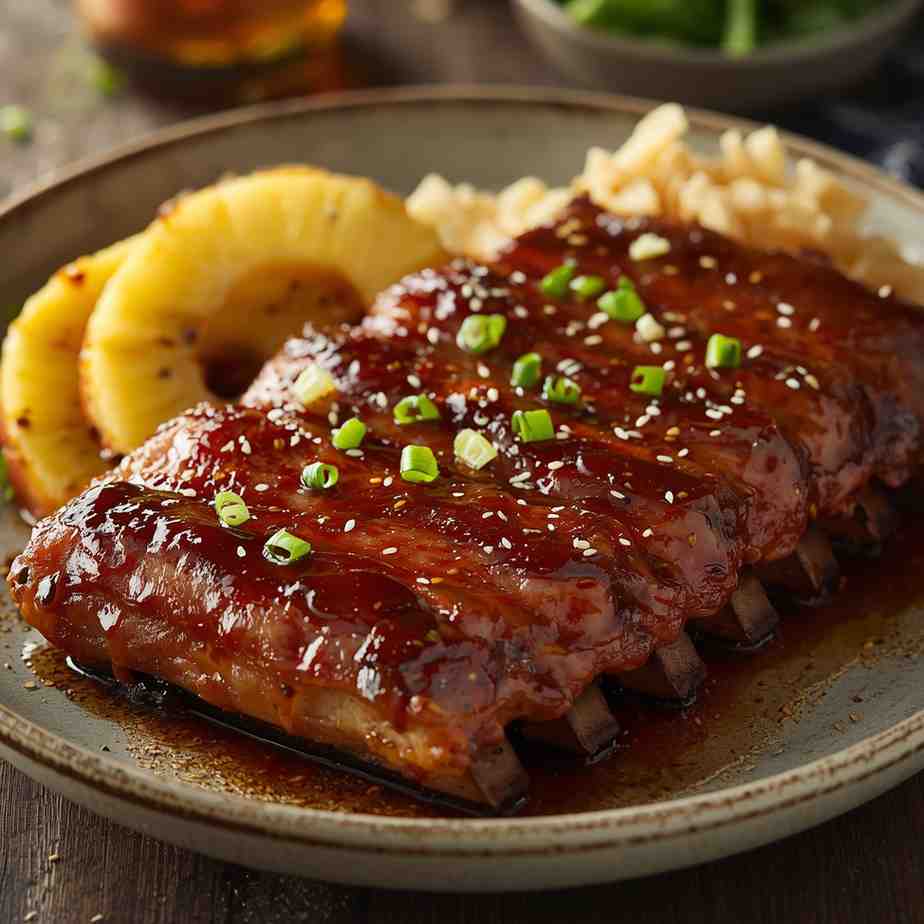 Step 5: Finish and Serve : Remove the ribs from the oven or grill. Brush with any remaining glaze. Garnish with chopped green onions, sesame seeds, and pineapple chunks. Serve immediately with rice, steamed vegetables, or a fresh salad.