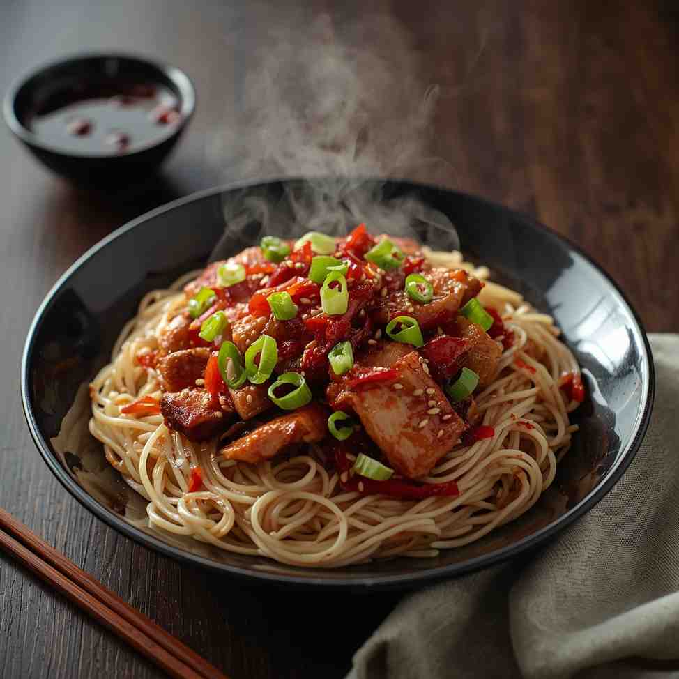 Spicy Szechuan Pork with Rice Noodles is a bold, flavorful dish inspired by traditional Szechuan cuisine. Known for its vibrant heat, numbing Szechuan peppercorns, and umami-packed sauce, this stir-fry delivers an exhilarating combination of flavors that tantalize the taste buds. Tender pork slices, coated in a spicy, garlicky sauce, are paired with soft, silky rice noodles that soak up the sauce, creating a perfect balance of spice, savoriness, and texture.