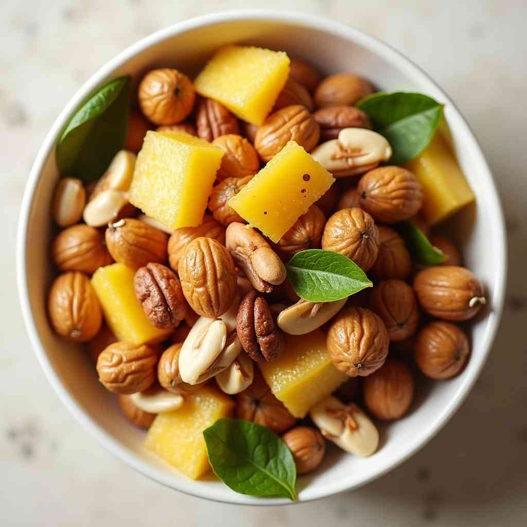 1. Prepare Ingredients : Chop dried pineapple and mango into bite-sized pieces if needed. Make sure nuts are roasted and fully cooled.